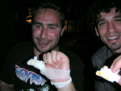 None of the students cut themselves, but both the assistants did! Here, Micheal and Jacob show off their matching thumb bandages. It's hard to see, but the cats are balancing on the boys' thumbs. |