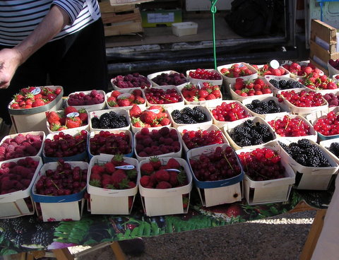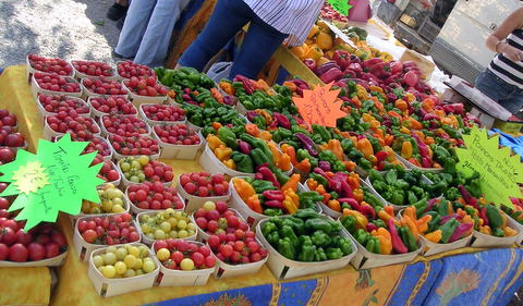 Our first full day set the pattern for the week: fresh fruit, yogurt, and pastries followed by shopping, sight-seeing, a little wine, more wandering, and lunch (with wine, of course) with Patrick. Then we were on our own to explore for the afternoon befoer returning to Cooking School by 5pm. These two photos are typical of the farmers markets we spent our time in several of the mornings. Appearently, my hunch that Cooking School was as much Shopping School was spot on. |