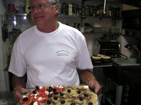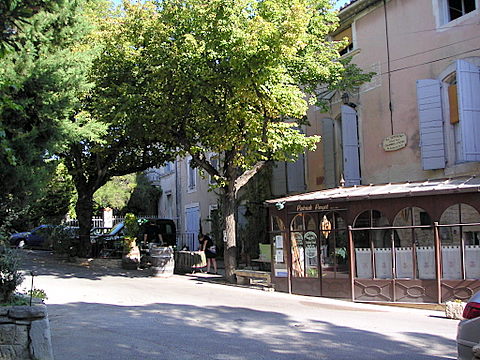 believe what you want. Here's the story of our fabulous week at Famous Provence Cooking School The school is set in Goult, a small village on top of a hill surrounded by the amazing farmland of the Luberon region of France. The school is actually a small hotel tucked away on a side street. The owner, Patrick Payet, renovated the property a decade ago and ran a restaurant in the ground floor before starting the cooking school. The photo to the right is the best I could do to capture the charm of the building - the iron-work enclosed room in the lower right is where we ate a light breakfast before each day's travels. The area under the trees is where we would usually gather for wine and cheese before and after dinner. On the warmest nights we even ate dinner out here. Our first day was a long one: SFO to CDG (Paris), shuttle bus to Gare d' Lyon, TGV to Avignon, rent and drive a car an hour east to Goult. Pulling into Goult, we had to ask directions to Patrick's place - Google Maps is not so good with medieval streets - but first, I had to back down a street that seemed too narrow for a car and attempt to use my new GSM cell phone to call Patrick (I never did get that stupid phone to work in France). We arrived in time for wine and cheese under the trees. After the first of several wonderful meals, Jacob took Mary and me for a walking tour of Goult. %%% add photos of the castle and the wooden sculptures around town. |