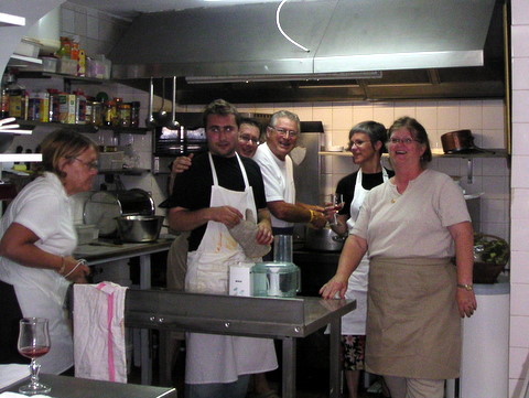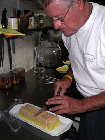 We prepared fois gras. Mary and I got to try de-veining it (no one else wanted to touch it). Here's Patrick slicing it after it chilled. I had lobbied hard all week to include it on the menu - I wasn't dissapointed. In fact, a couple of people at the table gave me their portions. It was fabulous! |