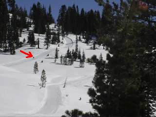 Early in the week (Monday?) Mary and Hope and I skied out to Devil's peak. The picture to the right is Mary and Hope skiing up Wagon Train. They're both moving in this picture: Hope is just starting a kick with her left leg and Mary is about to transfer weight to her left ski. We ate lunch at the warming hut and Mary and Hope watched as I skied up the horseshoe loop to the base of Devil's Peak. I'm hard to see, even with the telephoto. That's me going up on the right-hand picture. There's a little spec of yellow (my polartec vest) on top of the ridge in the left-hand photo. |