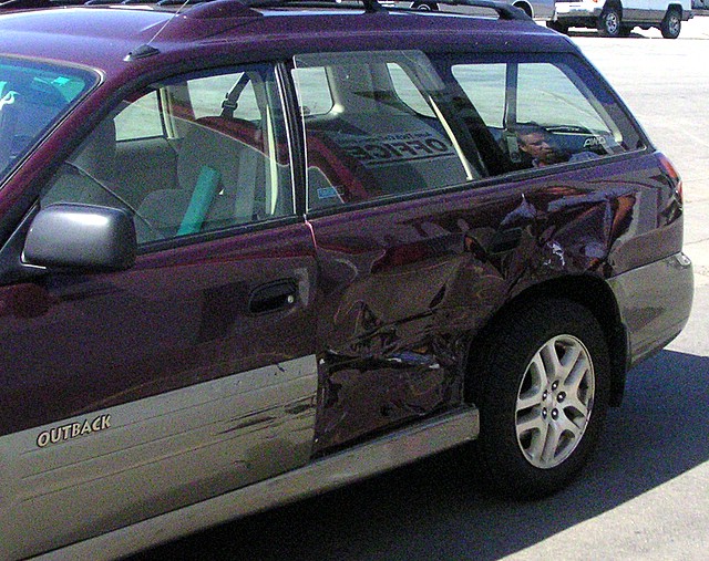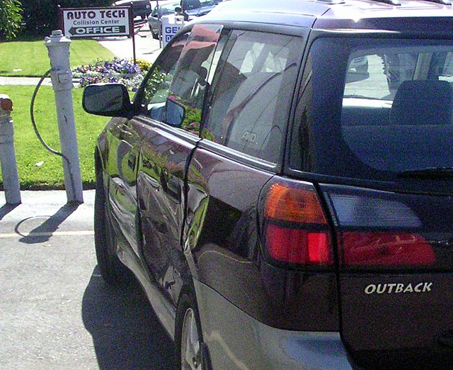 It doesn't really look like much, but it's enough to "total" this winestone red 2000 Subaru Outback with 106,000 miles. The preliminary estimate to repair it is over $7800. The insurance adjuster says the cost will only go up from there as he finds more damage behind the body panels. The Kelly blue book private party sale price is around $10,000 or so. GEICO won't pay anymore than some fraction (%50?, 80%?, %90?) of the value of the car in repairs.