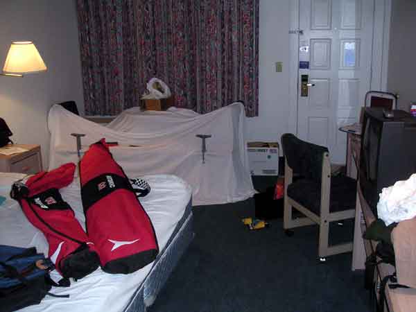 I set my Palm Pilot to go off at 5 am so that I could set up a makeshift waxing area in the motel room. I prepped one pair of skate skis and one for striding by clamping my portable wax bench to the up-turned dresser drawers that I had covered with a bed sheet.(the two "T"s on the bed sheet in the background of the photo below are the wax bench) It worked. I got no wax on the rug and I was on-time for my first on-snow sessions up on Mount Bachelor at 8 am sharp. On on.