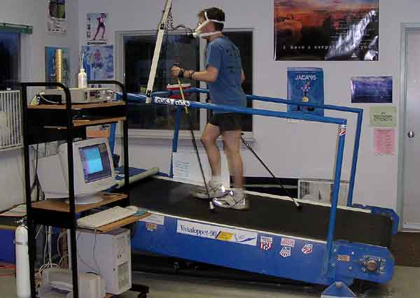 The protocol: The test starts at an easy walking pace with ski poles (to get all the skiing muscles into the test). The victim, er, subject wears a mask that measures inhaled air volume and exhaled CO2. Every 3 minutes, the incline and/or pace is increased and a blood sample is taken (ouch!). The treadmill doesn't stop until the subject gives up. After a 4 minute cool down walk, a final sample is taken. (ow, again)