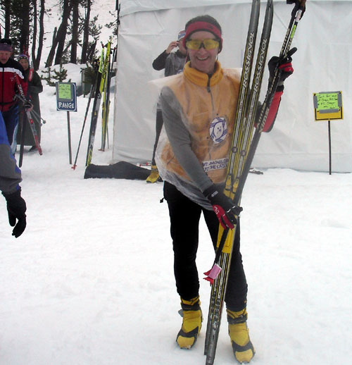 A light mist fell all morning. I'm wearing a clear "garbage bag" (made with arm and neck holes and emblazoned with the Mt Bachelor logo) to keep me a little drier. The tent behind me was reserved for the local XC Oregon racers and us campers. Although not heated, it kept us dry and was much roomier than the Nordic Center building that was packed with the general public. I have no idea why I'm smiling like that - I'm cold and wet.