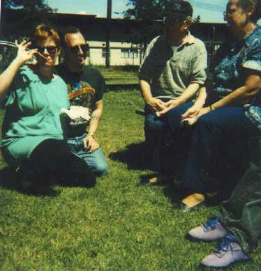 Sam will have a sister soon. In honor of that fact (and to get a pile of baby loot) Mark and Do had a combination baby shower and BBQ. A BabyQ, if you will. Lots of friends, family, friends of friends, and friends of family showed up. A groovy cake (babys in the icing and gummy items in the cake) was made by a friend of a family. This first picture shows (left to right) Do pulling a gummy worm from her mouth, Mark laughing, Dave (proud grandfather), and Verna (proud grammy) look on. Purple suede shoes (only visible in the 3x resolution version that you can download) belong to Mary. Go ahead and download it by clicking on the underlined Do in this paragraph (22k, babyq2.jpg, photo on left).