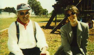 The BabyQ was held at a park behind the married student housing on Ninth Street. The park is right next to the train tracks. I think kids of all ages like to watch the trains go by. I know I do. The rest of Mary is visible in the photo on the right. That's Ruby's Uncle Alan in the tuxedo shirt and suspenders on the left. Download the 3x res of this photo (13k called babyq3.jpg, photo on the right).